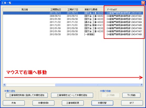 - 工事一覧画面の右側(スクロールバーで移動)「データフォルダ」を参照し、保存先が変更されていないか確認してください。